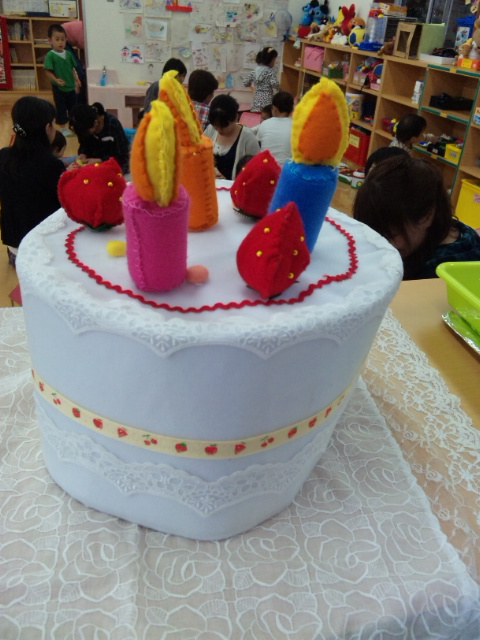 さてさて、16組の親子が集まっていたんだけど、想像以上に小さいちびっ子たち=0~1才=がほとんど.・゜#・.:♪:.・#えほん読みの前に、広場のスタッフの方たちから布製ケーキやメダルのプレゼント!