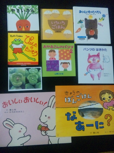 なかなか集中は難しいけど、手あそび(♪:あたま・かた・ひざ・ぽん)や紙芝居、ママ向けえほん、ピーマンネタで30分近く一緒に楽しめたのは、すごかったネ。
