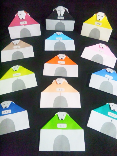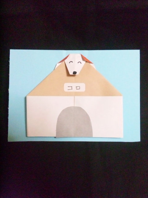 今月の折り紙は「犬小屋の犬………(『コロ』『チロ』『ムサシ』etc.全部名前、違います)