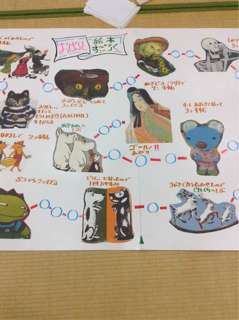 ちょっと広めのスペースの真ん中に、ソファーが置いてあって、その前には、絵本や読み物の本…自由に読めるようになっている。大型おはなし絵本すごろくや、