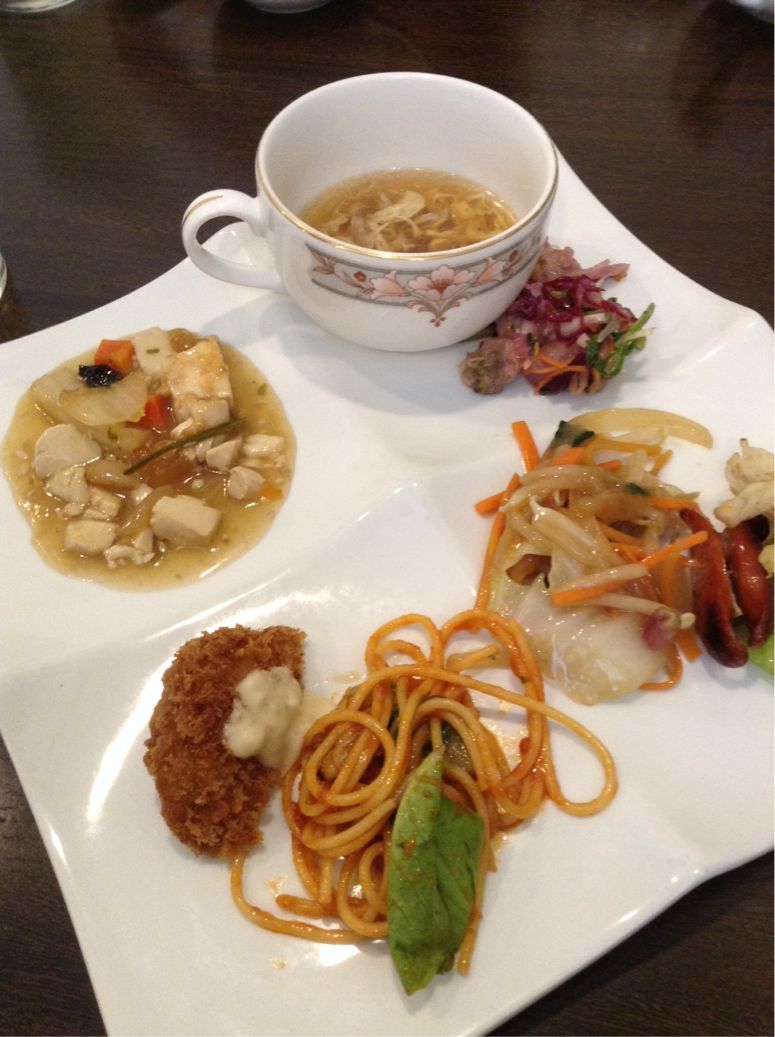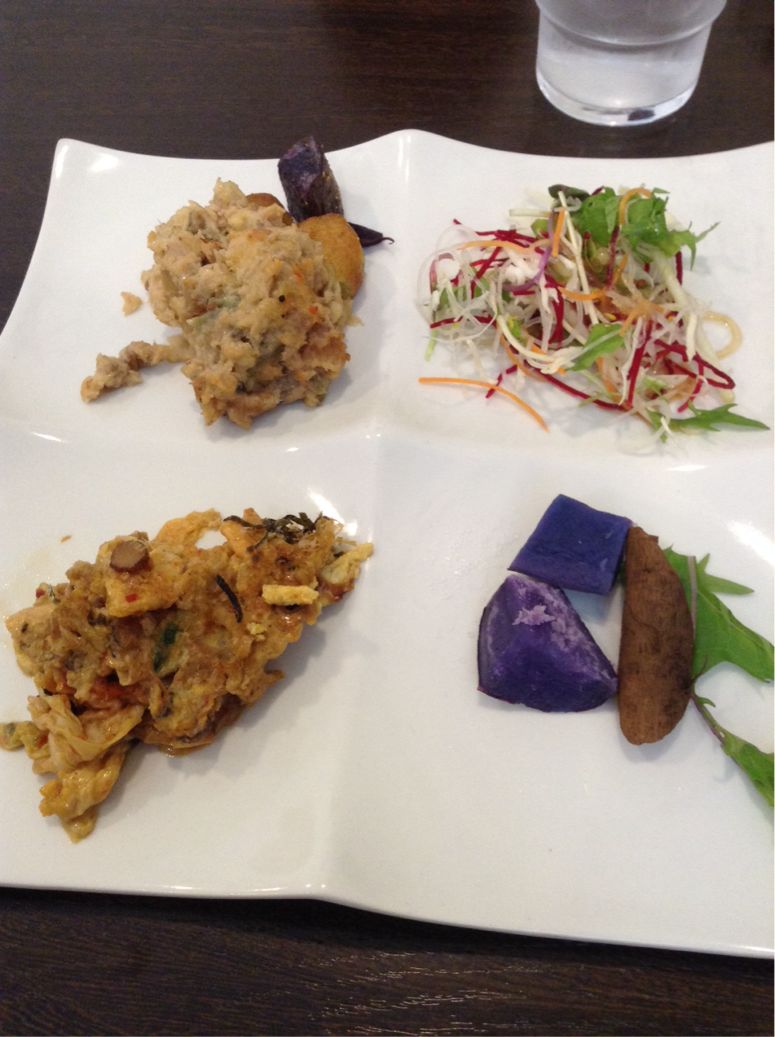 今日はビュッフェスタイル。(前回2013.9.5はランチプレート)ランチのピークが過ぎていて、少しゆったりできたのはいいけれど、メニューがあるのに空の器がいくつかあって少し残念でした。紫イモやポテト餅、美味しかった(^_^)