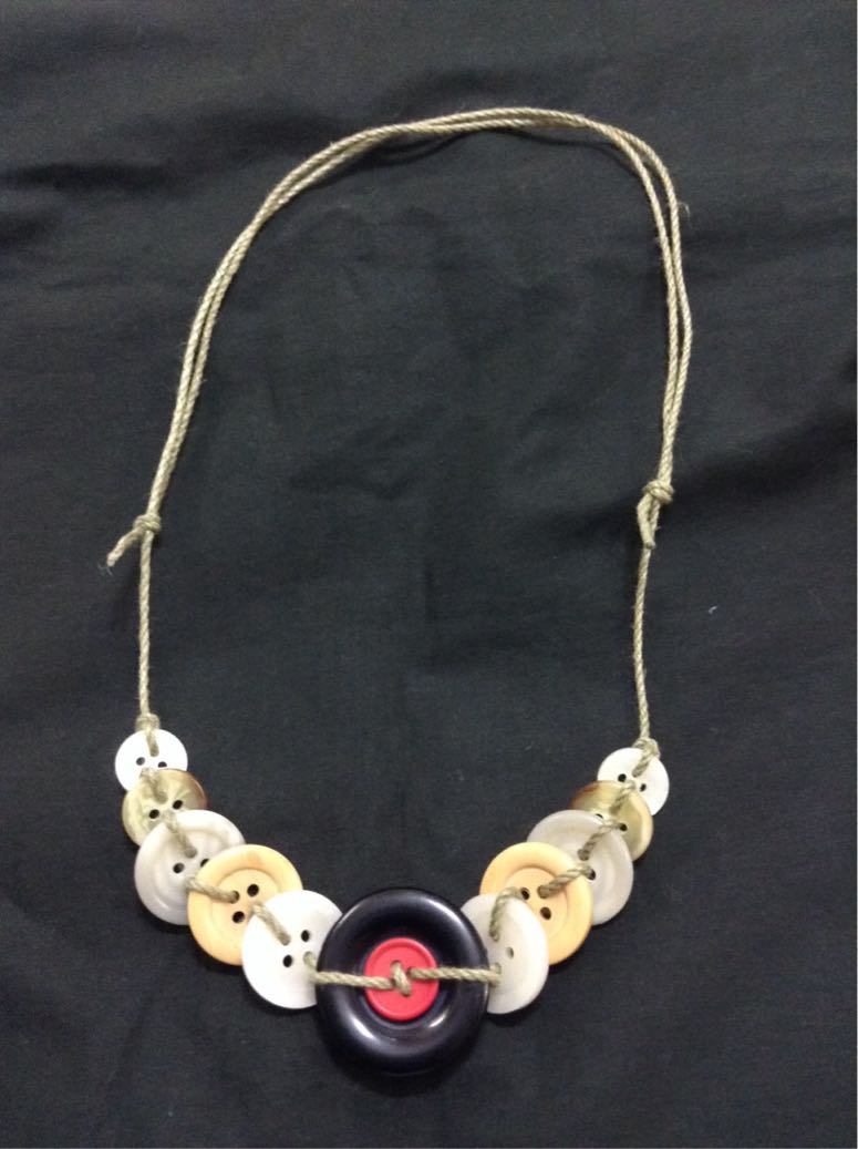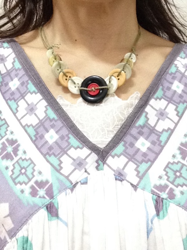 落ち着きを優先したくて、ヘンプの麻ひもを使うことにしたら、小さめのボタンの穴も小さくて通らなかったから、ボタンは一段になっちゃった。でもちゃんと隠せる!?