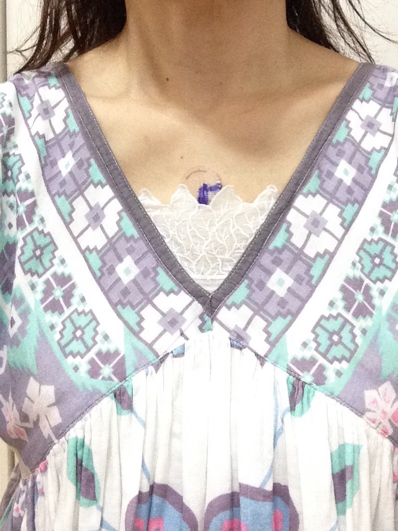 襟元の印が見えないよう、スカーフを巻いたり、エリの詰まったデザインを選ぶようにしていたけれど、あまりの暑さに…