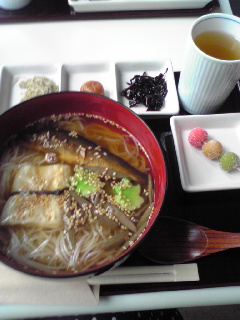 二人とも「季節のにゅうめんランチ」に決定!鮎の甘露煮、湯葉、ジュンサイがのったにゅうめんです。