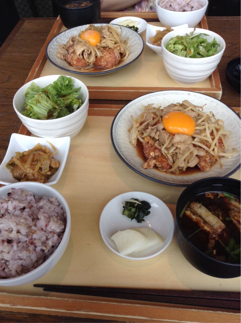 鶏の竜田揚げに豚の生姜焼き、卵の黄身乗せ、お肉ガッツリのメニュー!
