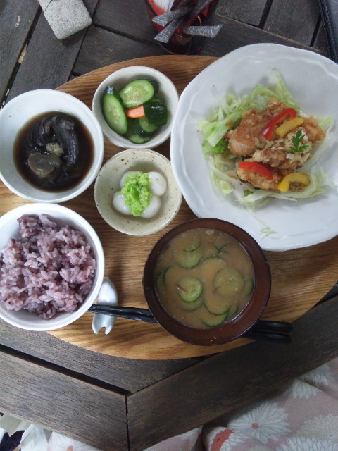 お昼時、店内は満席だったのでお庭の席=始めは暑かったけれど、落ち着けば、風、セミの声が心地好い.・゜#・.:♪:.・#