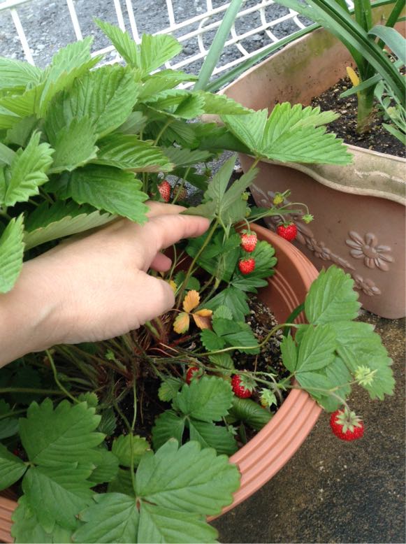いちごの実がなり、四つ葉のクローバーやラムズイヤー(葉っぱの手触りが子羊の耳のよう)のお花が咲いていた!