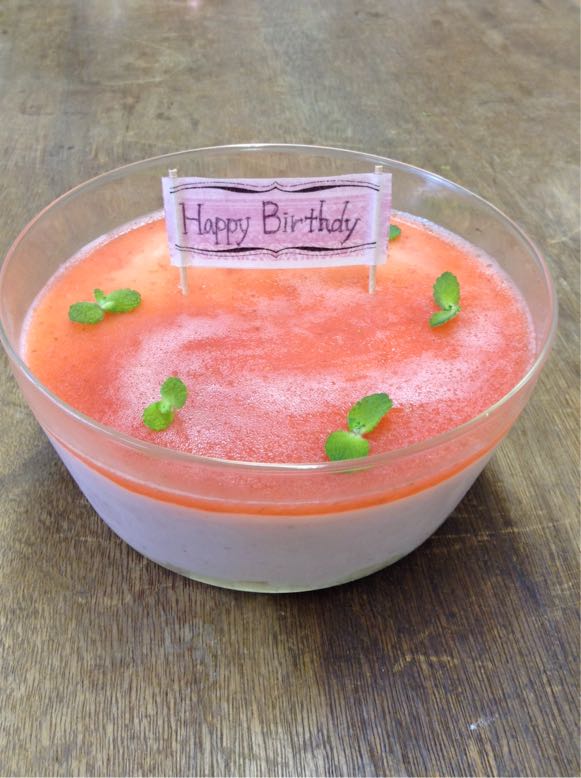 絵本を楽しむ会「ピーターラビット」の日とお誕生日が重なって、いつも美味しくてオシャレな手作りお菓子を持ってきてくれるよーこさんが、今日はお誕生日バージョンの「イチゴのムースケーキ」を作ってきてくれました(^O^)/