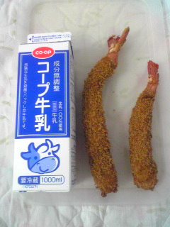 ↓1Lパックより大きい「まるは食堂」のえびフライ