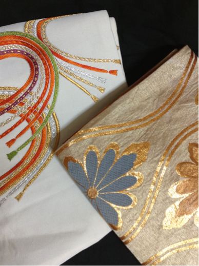 ↓西荻窪「ぐれいぷ」(🎶サンジャック近所のきものリサイクルショップ)で。自主練用と小物作り用に帯を2つ。