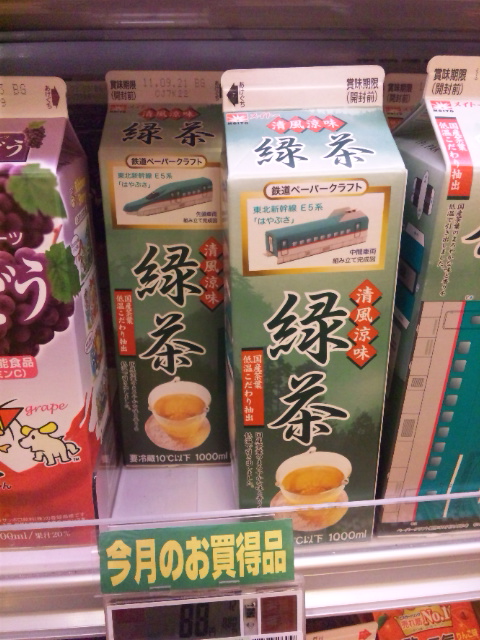 1リットルの紙パック麦茶=メイトー=にはドクターイエロー、緑茶には新幹線はやぶさが作れるよう印刷されている、という情報が!
