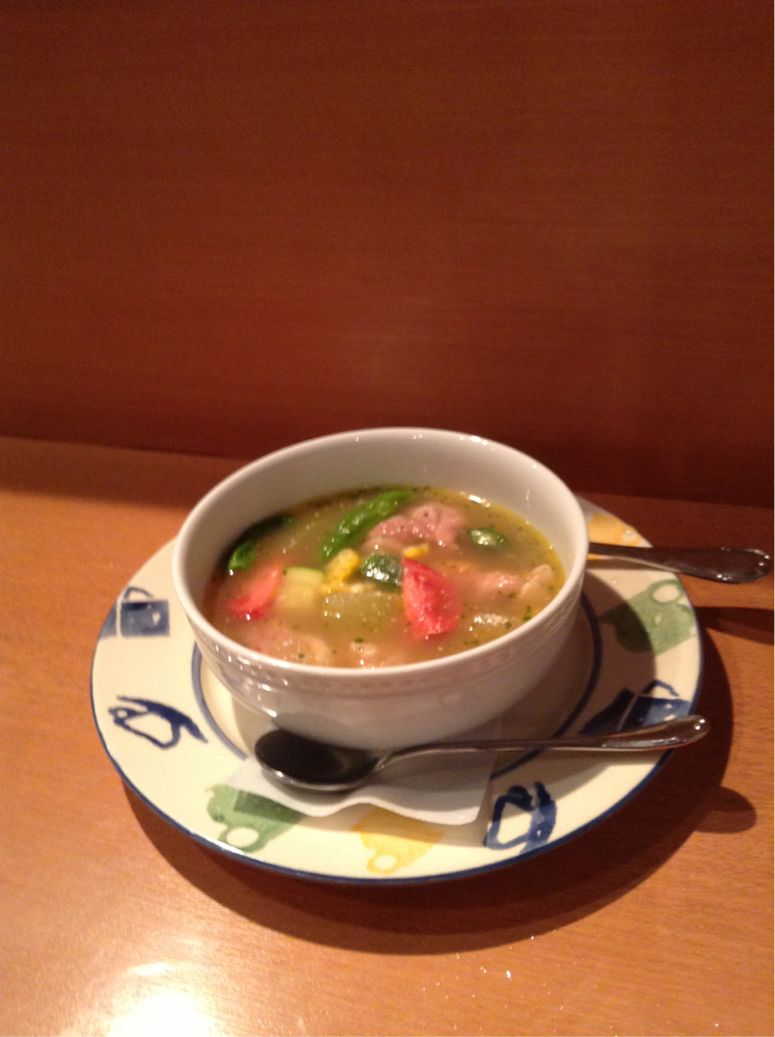 スープには、オクラやトウモロコシ、シシトウetc.いろんな野菜が入っていて、特にトマトや鶏肉が、美味しかった〜(^_^)