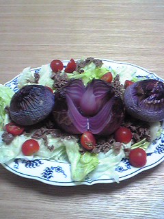 ↓「ほとんど初めて頼んだバースデーケーキ」:左 「I川さんからおすそ分けの紫玉ねぎの丸ごとオーブン焼き」:中