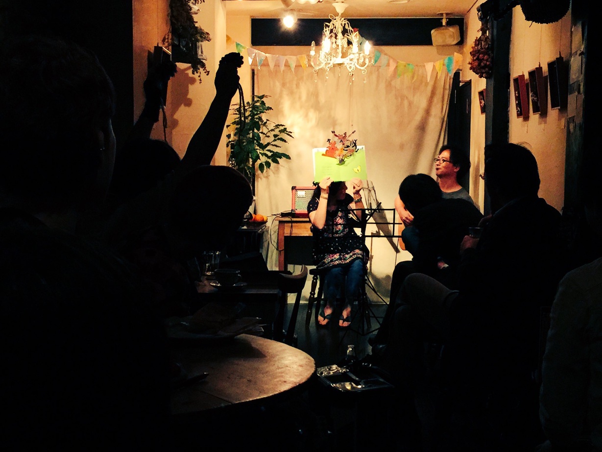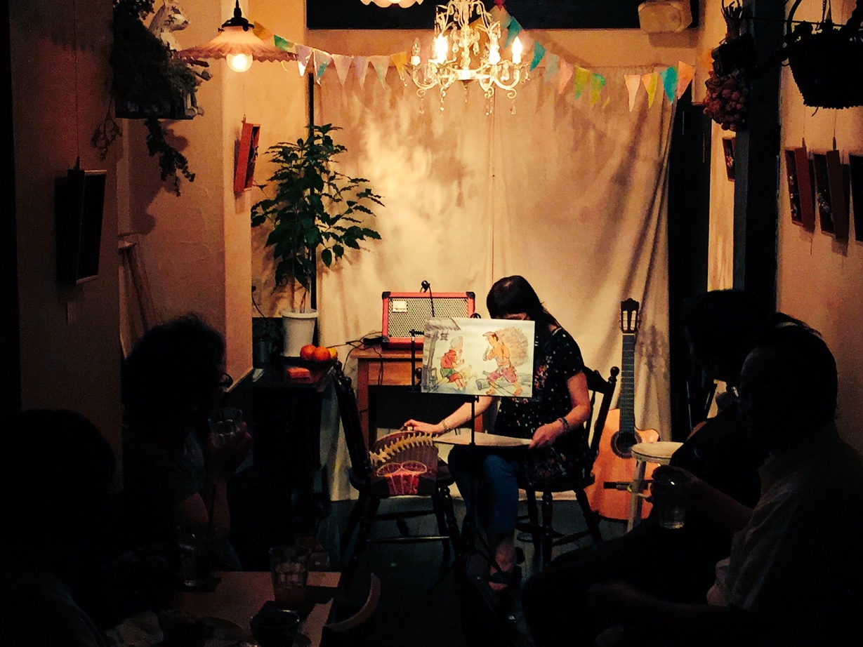 ギターリストのホスト役がいらして(絵本のときは伴奏を)、参加者はアコーディオンやピアニカ、クラリネット、トランペット、バイオリンと、そうそうたる楽器演奏!