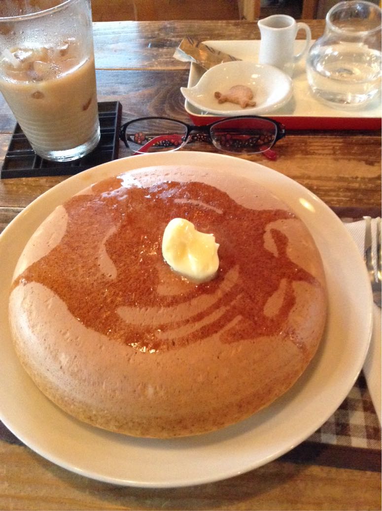 娘が、大きなパンケーキとカフェオレがお薦めと言っていたので注文すると…想像以上に大きくて、綺麗でビックリ!(サイズ比較用メガネに注目!)