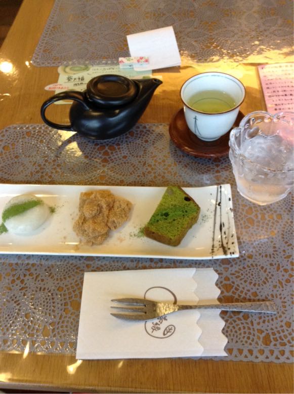 スイーツ三種盛り…葵(大福:抹茶クリーム入り)、 わらび餅、抹茶パウンドケー キとお茶(伊勢茶)のセット