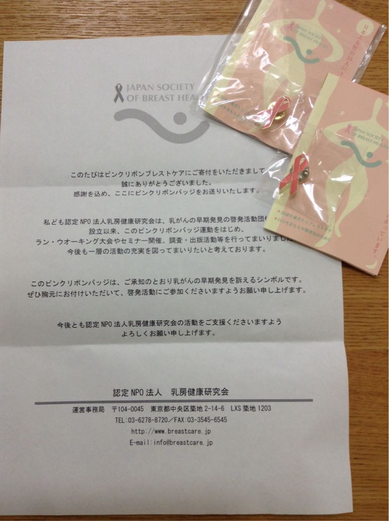 昨日届いた「ピンクリボンバッジ」