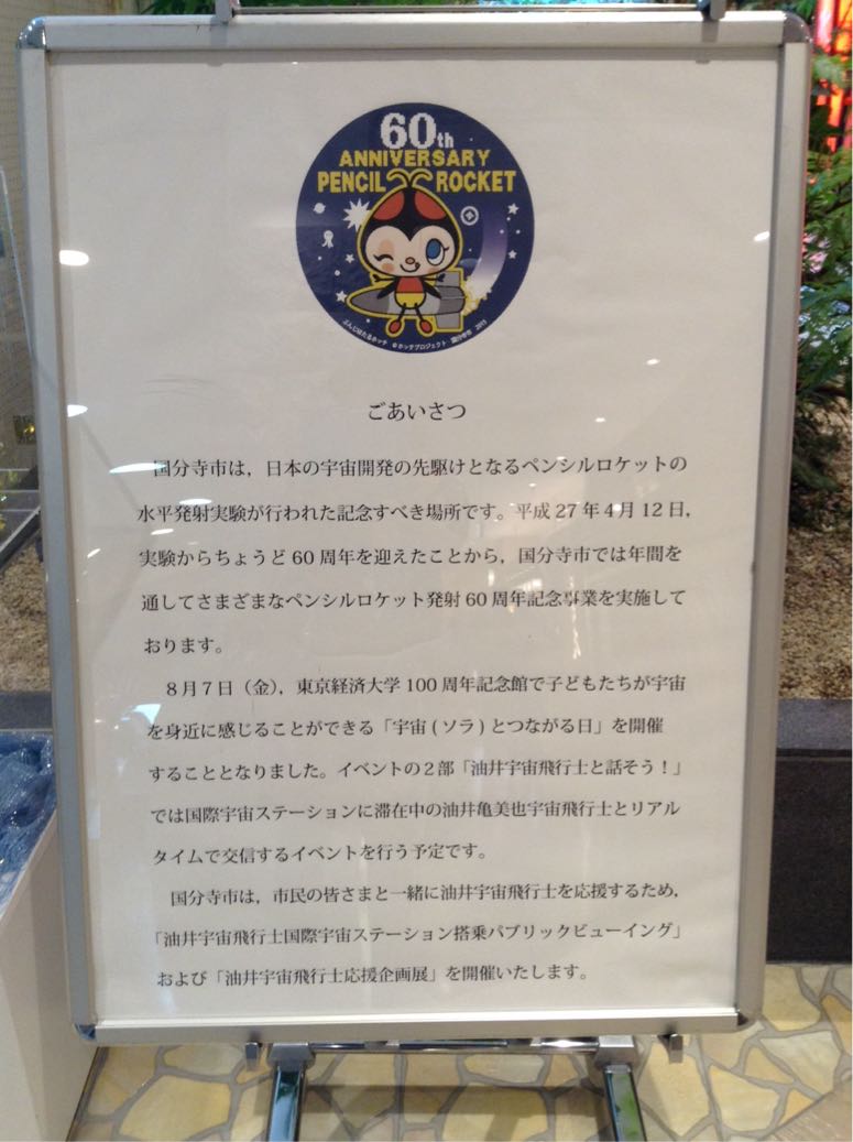 「国分寺市は、日本の宇宙開発の先駆けとなるペンシルロケットの水平発射実験が行われた記念すべき場所です。……60周年を迎えたことから、国分寺市では年間を通してさまざまなペンシルロケット発射60周年記念事業を…」