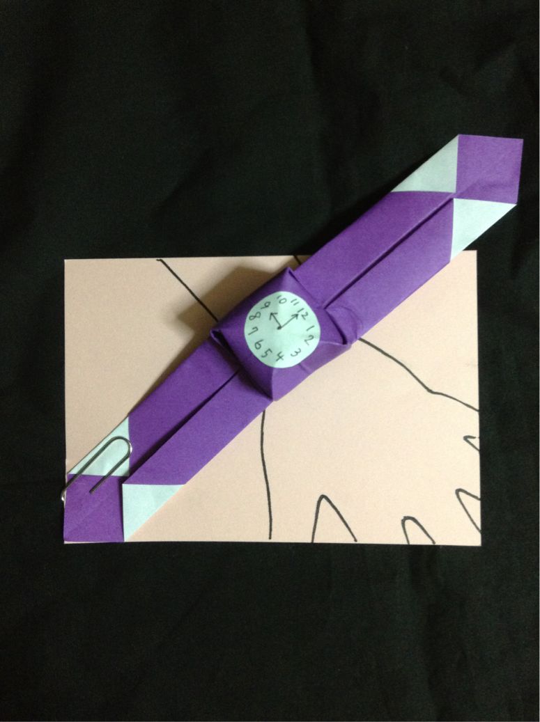 今月の折り紙は「うで時計」(両面テープ付)…115回目にして初めて立体。はめてあげたら、ちびっ子にも大人にも評判良かった。