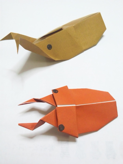 まず虫とり網や虫かごを厚紙で作り、その網?で折り紙で作った、カブトムシやクワガタを採るのです。