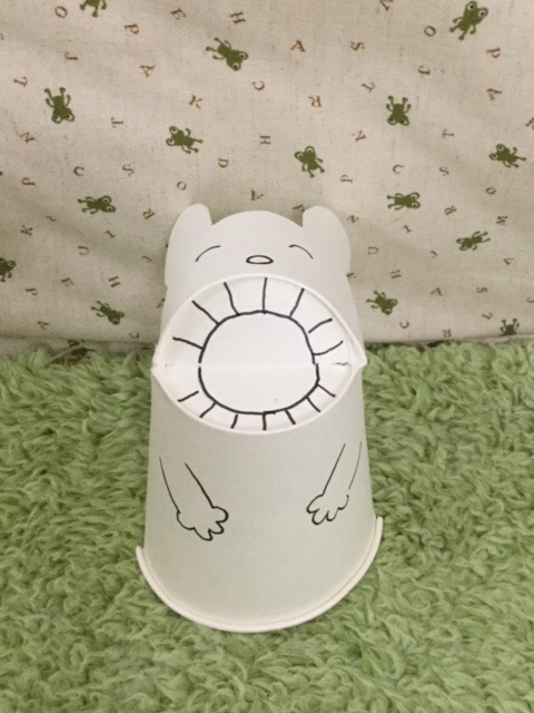 絵本を読んだあとは、歯みがき遊び用に、紙コップおもちゃを紹介。