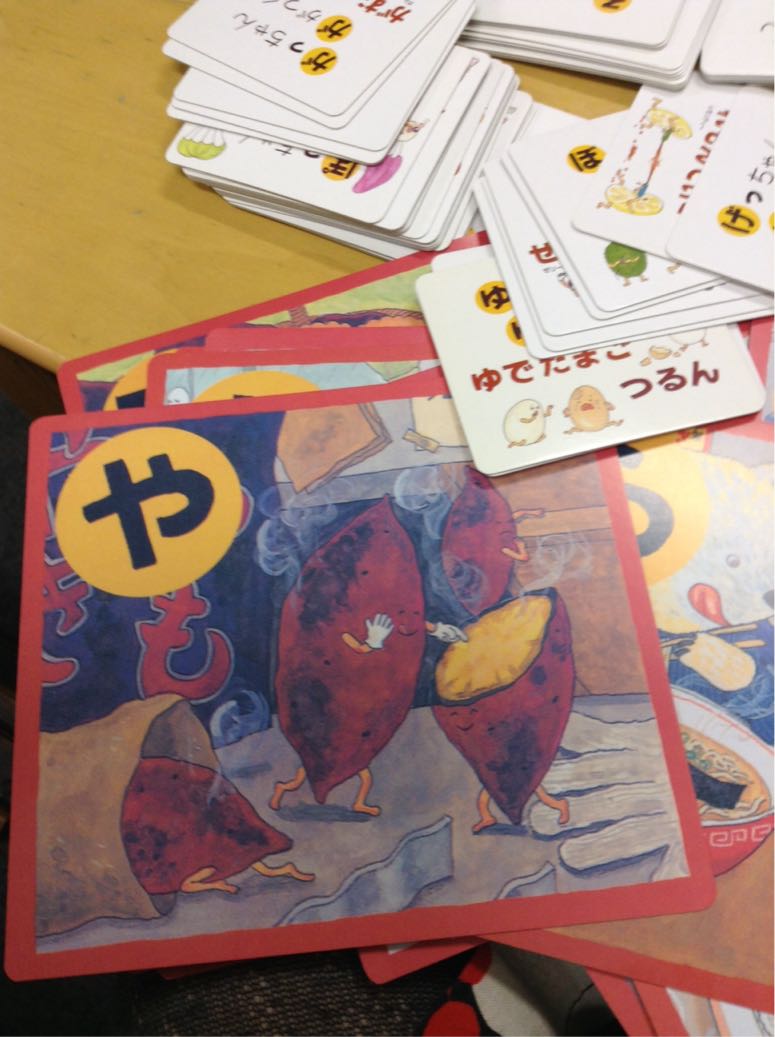 *「がぎぐげご」etc.の濁音や「ぱぴぷぺぽ」の半濁音、「ん」や「を」も入って、札はたくさんあるから、前半、後半2回、(人数調整で)ママやパパにも参加してもらって遊べました!