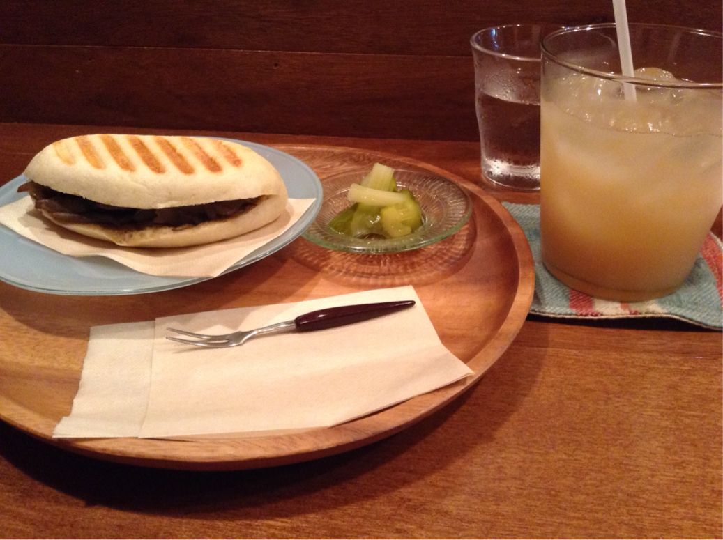 パニーニ(大根、なす、舞茸)&ももジュースを注文して待っていたら、Aンさんがやって来てビックリしてくれた!