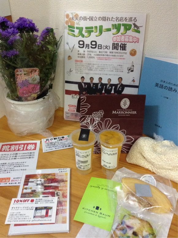 ケーキやゼリー、ポストカード、割引券、じゃんけんに勝ってお花の鉢植えetc.