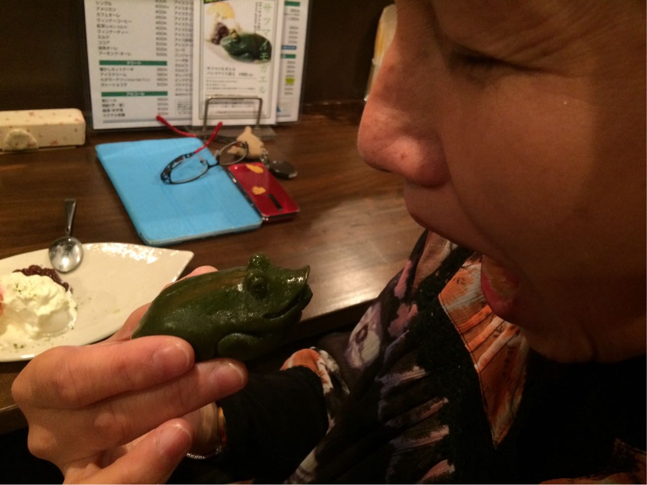 見落としそうな小さな入り口「ドア」は、1mぐらいしかなくて屈んで入ります。もう、ソレだけでテンションが上がってきて…中に入ると、壁いっぱいにカエルさん!