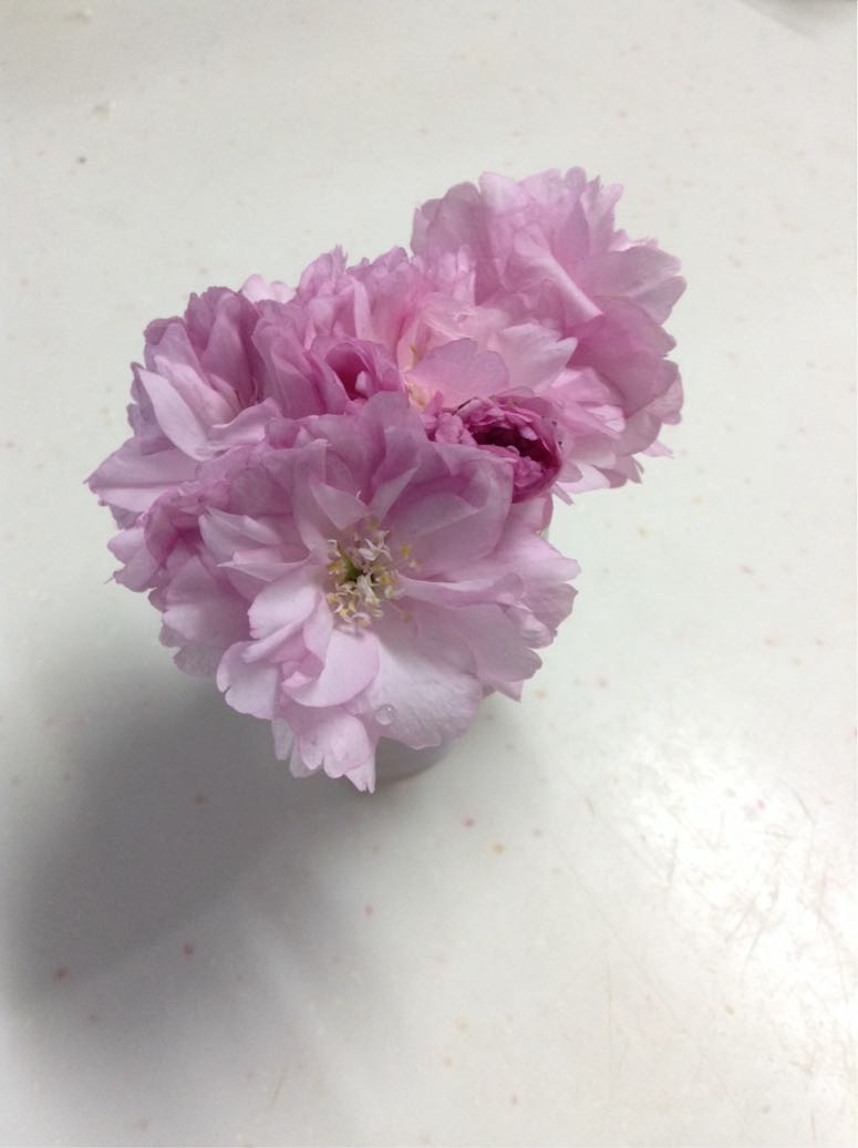 ちょうど昨日、強風に負けて落ちてしまった八重桜を拾えたので、それを見せることも出来て良かったナ。