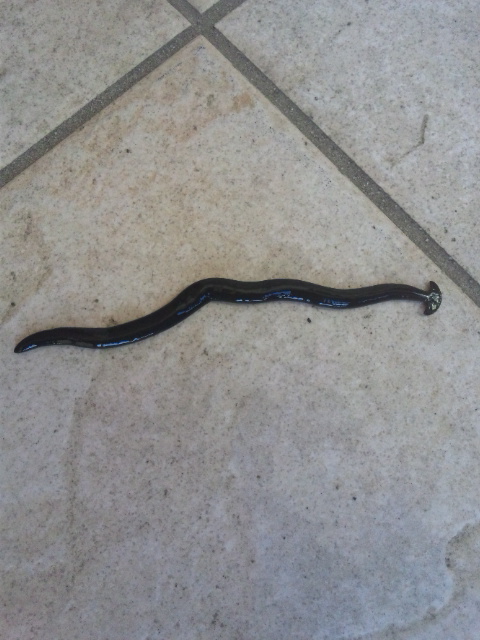 ↓生まれて初めてみた(「ヒル」ではなくて)「クロイロコウガイビル」でした